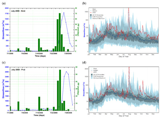 (a) Daily streamflow at Lespezi gauging station situated on the Siret River (blue line) and the precipitation amount at Rădăuți meteorological station (green bars) for the period 1 July–31 July2008; (b) The evolution of the flood peak in July 2008 (red line) at Lespezi gauging station compared to the daily streamflow pattern on an annual basis (blue shaded line); (c) Daily streamflow at Rădăuți-Prut gauging station situated on the Prut River (blue line) and the daily precipitation amount at Darabani meteorological station (green bars) for the period 1 July–31 July 2008 and (d) The evolution of the flood peak in July 2008 (red line) at Rădăuți-Prut gauging station compared to the daily streamflow pattern on an annual basis (blue shaded area). For the location of the gauging and meteorological stations; see Figure 1. The period 1981–2000 was used to compute the daily streamflow climatology in (b,d).