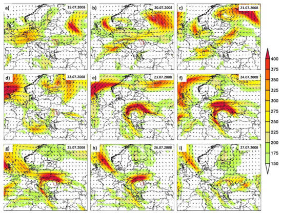 The extreme rainfall and the associated flood events in July 2008 were preceded by particular large-scale atmospheric circulation patterns at European scale (Figure 4 and Figure 5). During the 19–27 July 2008 period, the days with extreme precipitation events were associated with inter water vapor transport (WVT). The WVT reached a magnitude of ≈250 kg m−1 s−1 (and exceeded values of 350 kg m−1 s−1 between 23rd and 25th of July) over both Siret and Prut catchment areas, with the highest recoded values over Ukraine (Figure 4). The synoptic evolution of the tropopause level flow, prior to the flood peaks, is analyzed by using the dynamical tropopause on the 330 K isentropic level. Previous studies have shown that heavy rainfall and floods are linked with the upper level through being associated with the presence of elongated intrusions of air the so-called PV streamers [8,27,38]. Southward intrusions of air with high PV in the lower stratosphere or the higher troposphere are associated with the lowering of the dynamical tropopause, leading to vertical motions, cyclogenesis, and heavy rainfall. The days before the flood peak from July 2008 in the Siret and Prut River basins were associated with high PV values over the eastern part of Europe (Figure 5f–i). The temporal evolution and the spatial structure of the potential vorticity field indicate that in the days prior to the flood peak, a cut-off low was present over the central part of Europe moving eastward. The axis of the WVT (Figure 4) follows the non-linear behavior of the potential vorticity field. Positive upper level PV anomalies have the tendency to affect the structure of the atmosphere below them [39]. This is visible also in the case of the July 2008 flood events, when the high PV values over the eastern part of Europe observed between the 23rd and 27th of July were associated with a pivotal cut-off low that lasted for 4 days (Figure 5e–h) and warm air advection over the southeastern part of Romania and cold air advection over the northern part of our analyzed region (Figure S4), which led to heavy rainfall events over the Prut and Siret catchment areas.