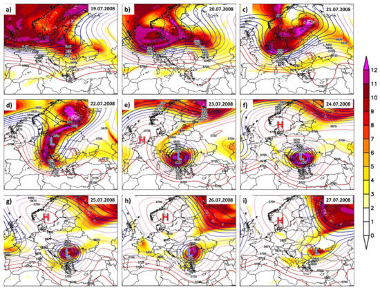 Daily potential vorticity (PV) at 330 K (shaded colors) and daily geopotential height at 500 hPa (Z500) (contour lines) for: (a) 19 July 2008; (b) 20 July 2008; (c) 21 July 2008; (d) 22 July 2008; (e) 23 July 2008; (f) 24 July 2008; (g) 25 July 2008; (h) 26 July 2008, and (i) 27 July 2008. Units: PV (PVU) and Z500 (m). L (blue) denotes low pressure system and H (red) denotes high pressure systems.