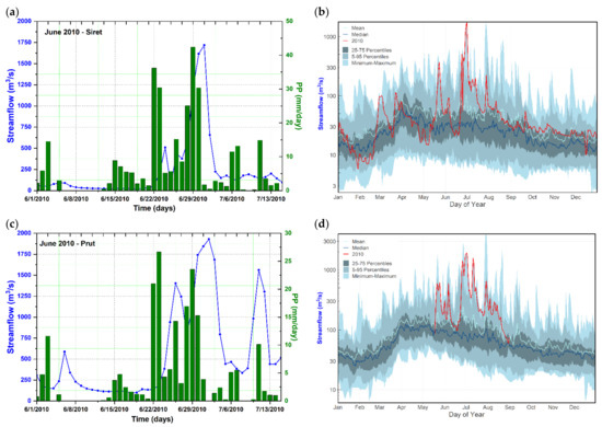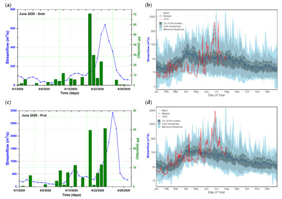 (a) Daily streamflow at Lespezi gauging station situated on the Siret River (blue line) and the precipitation amount at Rădăuți meteorological station (green bars) for the period 1 June–30 June 2020; (b) The evolution of the flood peak in June 2010 (red line) at Lespezi gauging station compared to the daily streamflow pattern on an annual basis (blue shaded line); (c) Daily streamflow at Rădăuți-Prut gauging station situated on the Prut River (blue line) and the daily precipitation amount at Darabani meteorological station (green bars) for the period 1 June–30 June 2020; (d) The evolution of the flood peak in June 2010 (red line) at Rădăuți-Prut gauging station compared to the daily streamflow pattern on an annual basis (blue shaded area). For the location of the gauging and meteorological stations, see Figure 1. The period 1981–2000 was used to compute the daily streamflow climatology in (b,d). For 2020 streamflow data was available just for the period 1 January 2020–31 July 2020.