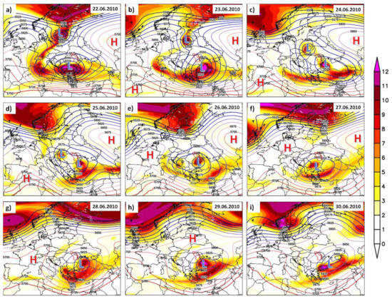 The extreme rainfall and the associated flood events in June 2010 were preceded also by particular large-scale atmospheric circulation patterns, such as in the case of the July 2008 event. Between the 22nd and the 30th of June 2010, the days with extreme precipitation events (Figure 6), were associated with intense water vapor transport toward the catchment area of both Prut and Siret Rivers (Figure 8). Between the 22nd and 26th of June, the water vapor transport was confined mainly over the northern part of the catchment area of Prut and Siret Rivers (Figure 8a–f), while between the 28th and 30th of June, the WVT was affecting the whole catchment area of the two rivers (Figure 8g–i). The heavy rainfall events in June 2010 were triggered by strong high PV anomalies over the analyzed region (Figure 9) and several pivoting low-pressure systems (Figure 9), which developed in cycles of two or three days. This happened in the context of a double blocking structure (simultaneous action of the European ridge on the west and east of the European Continent), as captured by the configuration of the geopotential at the level of 500 hPa (Figure 9). As a result of this extreme blocking pattern, the low-pressure system remained relatively stationary (Figure 9e–i), so rainfall events were recorded over several days. Warm, moist air was pulled northward from the Black Sea to feed the storm system (Figure S5). The positive PV anomalies associated with cut-off lows, and the structure of the geopotential height anomalies at the 500 hPa allowed the advection of warm air from the south-east and cold air from the north toward our analyzed region, leading to heavy rainfall events and as a consequence to extreme flooding over the Prut and Siret basins. Moreover, the combination of warm air from the southeast and cold air from the north led to amplification and persistence of the atmospheric blocking on the eastern side of our analyzed region for most of the period when the flooding occurred. As a result, the low-pressure systems that reached the Black Sea basin were enriched with large amounts of water vapor afterwards (Figure 8), which later led to the extreme rainfall events in the northern part of the catchment area of Prut and Siret Rivers.