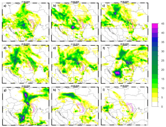 Daily precipitation totals (PP) for(a) 17 June 2020; (b) 18 June 2020; (c) 19 June 2020; (d) 20 June 2020; (e) 21 June 2020; (f) 22 June 2020; (g) 23 June 2020; (h) 24 June 2020 and (i) 25 June 2020. Units: PP (mm/day).