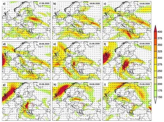 Between 17th and 24th of June 2020 were days with extreme precipitation events, which were associated with intense water vapor transport over Ukraine and the northern part of Romania (Figure 12). Between the 17th and 22nd of June, the axis of the water vapor transport was confined mainly over the northern part of Ukraine, where the highest rainfall amounts were recorded (Figure 12a–f). The heavy rainfall events in June 2020 were triggered, such as in the case of July 2008 and June 2020 events, by strong high PV anomalies extending from the North Atlantic basin toward the eastern part of Europe (Figure 13) and several low-pressure systems (Figure 13), which developed in cycles of two or three days. Opposite to the June 2010 event, the June 2020 event featured a diffluent blocking pattern (Figure 13), where a high-pressure center started to slide above a low-pressure center on the 21st of June 2020, reaching this northward center on the 24th of June 2020. The positive PV anomalies associated with the moving low-pressure system, and the structure of the geopotential height anomalies at the 500 hPa allowed the advection of cold air from the north toward our analyzed region (Figure S6), leading to heavy rainfall events especially over Ukraine and the north-eastern part of Romania. As in the case of the June 2010 event, the low-pressure systems that reached the Black Sea basin were enriched with large amounts of water vapor afterwards (Figure 12) and moved toward the northeastern part of Romania, leading to heavy rainfall and flooding. Under the aforementioned synoptic conditions, the atmospheric instability over the eastern part of Europe led to stormy phenomena and rains with torrential character, the most affected areas being the north-eastern part of Romania, the Republic of Moldova, and Ukraine.