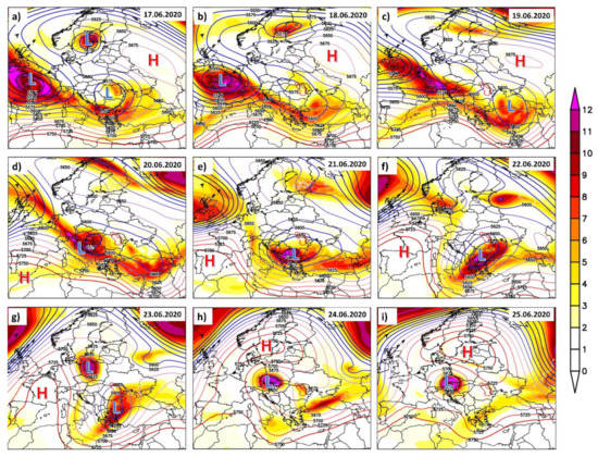 Daily potential vorticity (PV) at 330 K (shaded colors) and daily geopotential height at 500 hPa (Z500) (contour lines) for: (a) 17 June 2020; (b) 18 June 2020; (c) 19 June 2020; (d) 20 June 2020; (e) 21 June 2020; (f) 22 June 2020; (g) 23 June 2020; (h) 24 June 2020 and (i) 25 June 2020. Units: PV (PVU) and Z500 (m). L (blue) denotes low pressure system and H (red) denotes high pressure systems.