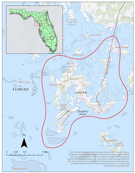 - U.S. Fish & Wildlife Service (FWS). Home—Cedar Keys—U.S. Fish and Wildlife Service. Available online: https://www.fws.gov/refuge/cedar_keys/ (accessed on 25 February 2021).