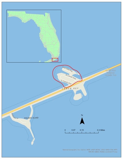 Conch Key is a small, traditional fishing community that has not changed significantly in its infrastructure since its development in the mid-20th century. The five-acre island is located in the Middle Keys just east of the city of Marathon (Figure 2). Unlike the other two communities, Conch Key is already experiencing the effects of SLR with some areas of the island underwater at high tide. Conch Key is unique from the rest of the Florida Keys in that it is zoned as a special commercial fishing district and is one of the last communities of its kind [34]. This zoning allows Conch Key’s residents to fish commercially from the island, pile lobster and crab traps in their front yards, and keep their commercial fishing boats at their docks. Conch Key consists of a mix of retirees, commercial fishers, charter captains, and retail/hotel operators. In 2018, at the time of this study, there were approximately 10 commercial fishing families and three wholesale distributors on the island. The main fisheries in Conch Key include spiny lobster, stone crab, and finfish.