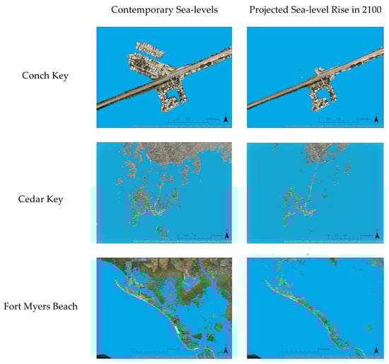 Examples of maps showing contemporary sea levels and the scenario of one meter of sea-level rise by 2100 in Conch Key, Cedar Key, and Fort Myers Beach.