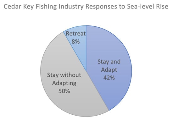 However, whether the aforementioned state-driven initiatives, and related private efforts, will prove effective in holding back the sea and mitigating SLR impacts in Florida (and elsewhere) remains unclear, as predictions vary greatly; some predict widespread human migration away from coasts [22,23], while others point to emerging and maturing technical ability that will enable the successful protection of coastal areas [24,25]; organizational networks, in particular, may play a role at the local level to prioritize policies and technology [26]. There are also many important psychological aspects of adaptation, and an individual’s perception of risk is paramount [27]. While experience influences individuals’ concerns over climate change [28], worldviews and values may shape risk preferences, especially as these relate to policy options; thus, decision-making is likely more complex than a form of rational utility maximization at the individual level [29]. The goal of this study was to assess fishing industry perspectives of SLR risk and adaptation in the three Florida coastal communities, and the primary objective was to evaluate how community level factors, such as the types of fisheries, levels of resilience, and amount of SLR-related threat, influence views on adaptation.
