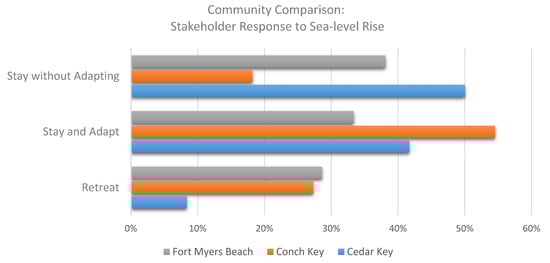Across the three communities featured in this study, 43 percent of the interviewees reported that they would ‘stay and adapt’, 34 percent reported that they would ‘stay without adapting’, and 23 percent said that they would ‘retreat’ or move inland if SLR began affecting their lives negatively. Respondents in Conch Key and Fort Myers Beach were more likely to choose ‘retreat’ as an option than respondents in Cedar Key (Figure 8). Conch Key respondents were more likely than the other two communities to choose to ‘stay and adapt’ and Cedar Key respondents were the most likely to choose ‘stay without adapting’ as a response.