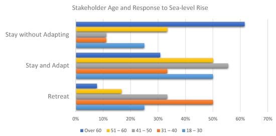 Many of the individuals in this study who were anti-adaptation were in the older generation. Across the three communities, age was a common denominator in the SLR response to stay in the area without adapting. Studies have shown that climate change belief certainty and climate change risk perception are negatively correlated with age [42,43,44]. The finding of age as a driver could contribute to a demographic shift in at-risk coastal communities that could increase the population’s vulnerability and lower their overall resilience.