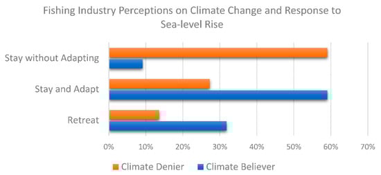 Participant age, worldview, and community identity all factored into individuals’ response to the potential SLR scenario. These findings support coastal planning efforts by illustrating why coastal planning must be conducted in a way that is sensitive to place-based cultural norms and potential ideological or worldview issues such as climate change skepticism [45]. Determining the factors behind how fishing industry members will react to sea-level rise provides managers with an important baseline for creating community-informed adaptation plans [46,47]. In other words, fostering consensus in these communities about the risks of sea-level rise may equally or more important than raising awareness.