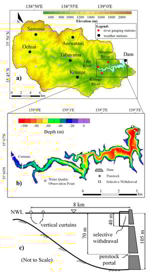 The Ogouchi catchment (Figure 1a), with an area of 263 km2, has six weather observation stations with more than 50 years of meteorological records. Three tributaries drain towards the reservoir, and each has its own gauging station with almost the same length of records as the weather stations. Figure 1b provides the reservoir bathymetry, where the observation point for temperature and other water quality parameters is indicated. Additionally, Figure 1c shows the location of the facilities, such as dam penstock, SW facility, and VC, along the longitudinal section. This study points out three distinct periods of operation, namely, (1) Period A for DPW operation for 1959–1991, (2) Period B for a purely SW operation for 1992–2001, and, lastly, (3) Period C for the combined operation of SW and VC for 2002–2016. More comprehensive details of the study site and the reservoir’s operation history can be referred to in the paper of Duka et al. [].