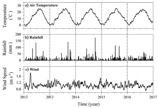 Typical variation of (a) air temperature (11-day moving average), (b) rainfall, and (c) wind speed from 2012 to 2016 from the dam station.
