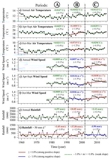 Long-term trends were evaluated using the Mann–Kendall (M–K) test [,] at a significance level α of 0.05. A nonparametric estimate of the slope of the trend, called Sen’s slope [], is used in this study rather than that from regression based on the least-squares method. The M–K test was performed for the long-term data; henceforth, the magnitude of the slope is expressed in terms of Sen’s slope. For short-term trends, i.e., for every period (A, B, and C), simple linear regression was carried out to determine the slopes of meteorological parameters. Since the M–K test was not carried out for short-term trends, the slope was only expressed using linear regression for simpler analysis.