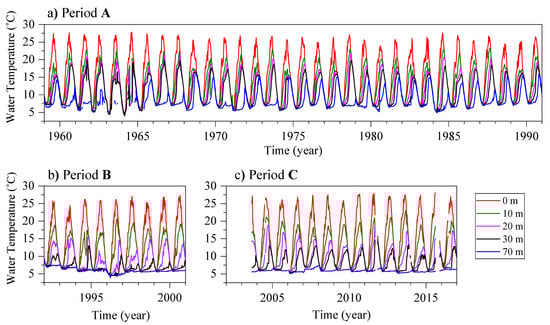 Weekly monitoring records of reservoir temperatures are available from 1959 until 2001, while daily records can be accessed from 2003 until 2016 (Table 1) from the Bureau of Waterworks of the Tokyo Metropolitan Government []. Raw temperature values from depths of 0, 10, 20, 30, and 70 m were examined. The temperatures at these depths were averaged for the year and the two seasons. The long-term trends of SWT were subjected to the M–K test and the subsequent results were compared with the trends in air temperature. Differences among the three periods of operation were evaluated using Kruskal–Wallis and rank-sum tests. It has to be clarified that the analysis in this paper consists only of a single measuring station for water temperature. The availability of remote-sensed temperature data for the free surface [] could be useful to shed light on the temperature distribution of the upper layer of the reservoir and establish the roles played by the tributaries.