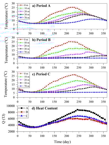 In terms of heat content (Figure 5d), the Q peaks around Day 270 (end of September), while it is the lowest around Day 75 (mid-March). Period A consistently attained the highest amount of heat stored in the reservoir. Periods B and C have similar trends, although Period C has relatively higher heat content than Period B. Although the SW facility was in operation in both these two latter periods, the effect of VCs may have played a role in the higher heat content of Period C. The observed differences in the plots of temperature profiles and heat content suggest that the operation of the facilities significantly influenced the thermal structure of the reservoir. This is further explained in the succeeding sections.