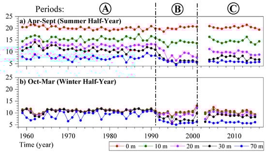 Average annual water temperatures at different depths from 1959 to 2016 for (a) the summer half-year and (b) the winter half-year.