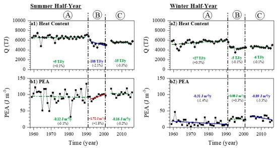On average, for the summer half-year (Figure 7), Period A shows the highest value of Q, with 6600 TJ, followed by C with 5500 TJ, and, lastly, by B with 5200 TJ. In terms of PEA, Period C obtains the highest average value of 103 J m−3, followed by B with 94 J m−3 and A with 93 J m−3. For the winter half-year, Period A still obtains the highest average Q, followed by C and then B, while stability in terms of PEA is still highest for C, followed by B and then A. In summary, Period A manifests higher Q but lower PEA than Periods B and C. Higher Q is observed for Period A as it has a warmer water column and thicker epilimnion. High stability, as described by PEA, is observed in Periods B and C, as attributed to stronger vertical stratification in these two periods.