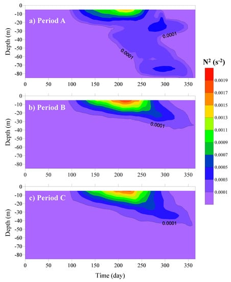 as a measure of the strength of the buoyancy []. The weekly values of N2 were computed for each layer from the surface to the bottom of the reservoir for all available data from 1959 to 2016. Contour plots were made to represent average stability in a year for each of the three periods.