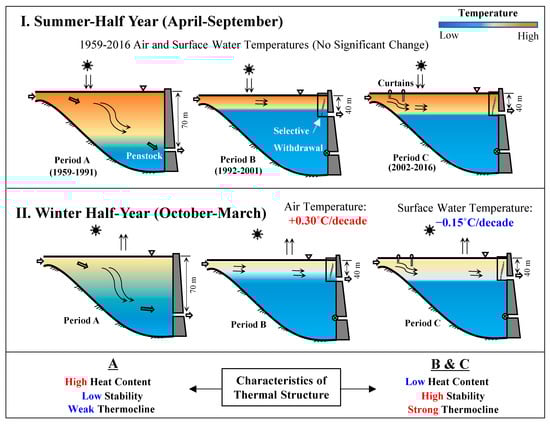 The downstream outflow control by DPW and SW and the upstream inflow interception by VCs can explain the significant differences in water temperature distributions between the three periods for both the summer half-year and winter half-year, as shown in Figure 9.