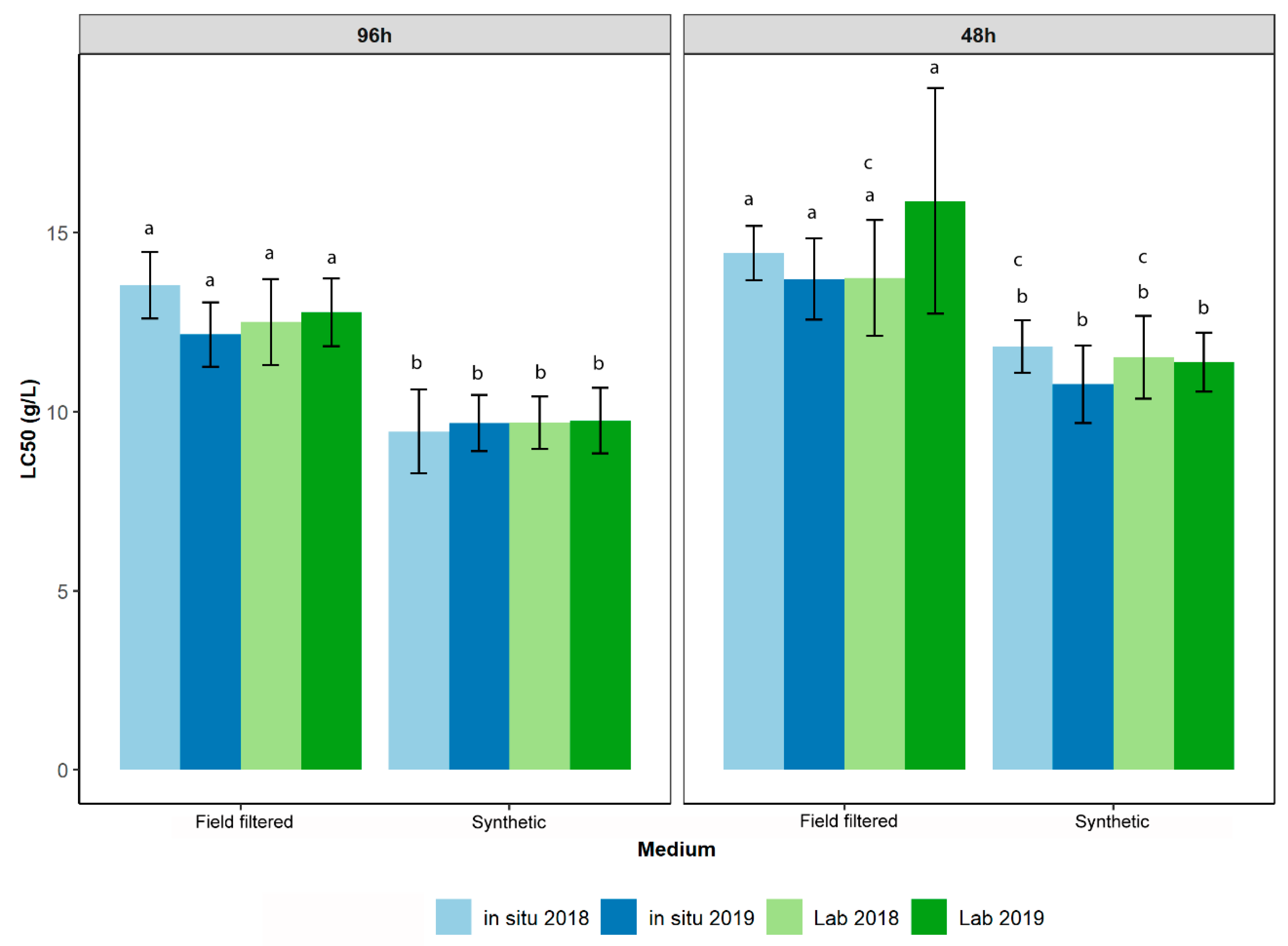- Water matrix characterization: description of the physico–chemical characteristics of water used as a medium and ensuring the stability of the stressor under study [28,30]. Indeed, the behavior of the stressor can be affected by interactions with several characteristics of the water matrix, including pH and temperature, thereby modifying the concentrations to which the organisms are exposed. Chemical analyses also provide baseline data of the chemicals to which organisms are exposed;