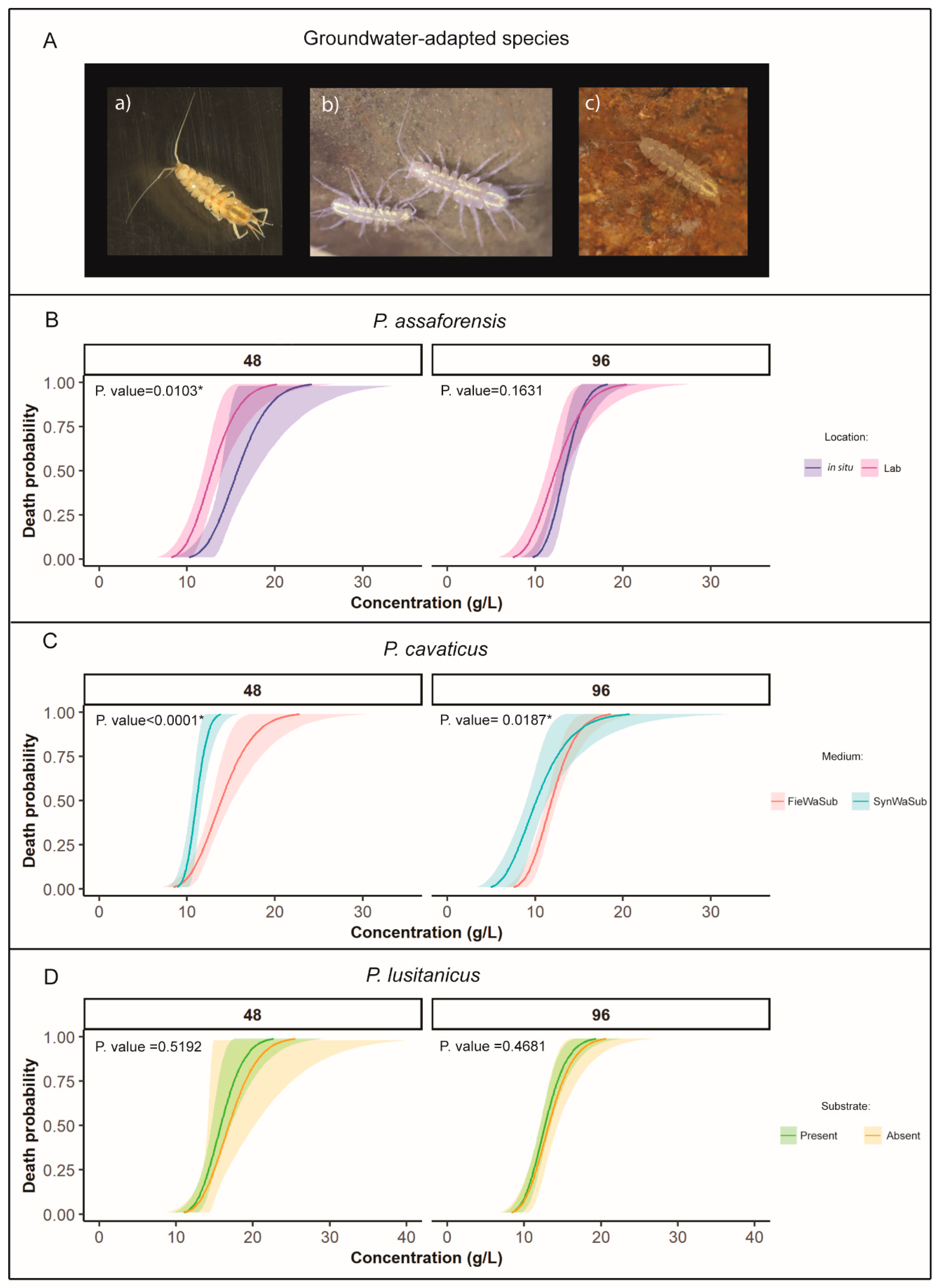 - Di Lorenzo, T.; Di Marzio, W.D.; Fiasca, B.; Galassi, D.M.P.; Korbel, K.; Iepure, S.; Pereira, J.L.; Reboleira, A.S.P.; Schmidt, S.I.; Hose, G.C. Recommendations for ecotoxicity testing with stygobiotic species in the framework of groundwater environmental risk assessment. Sci. Total Environ. 2019, 681, 292–304. [Google Scholar] [CrossRef]