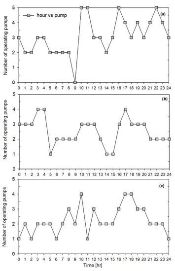 As can be seen in Figure 12, pump number 7 had been switched off only for 6 h during this day. This pump has mostly been used during medium consumption hours. Also, this pump had been switched on at all peak power consumption hours. The results from this section are shown as binary model timing schedule in Table 3.