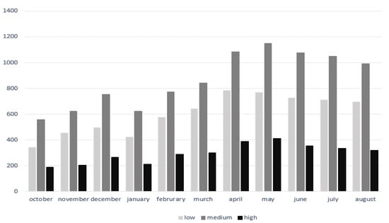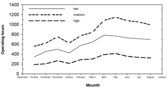 Total operating hours at low consumption, medium consumption, and high consumption hours from October 2016 to August 2017.