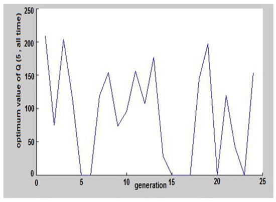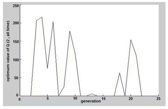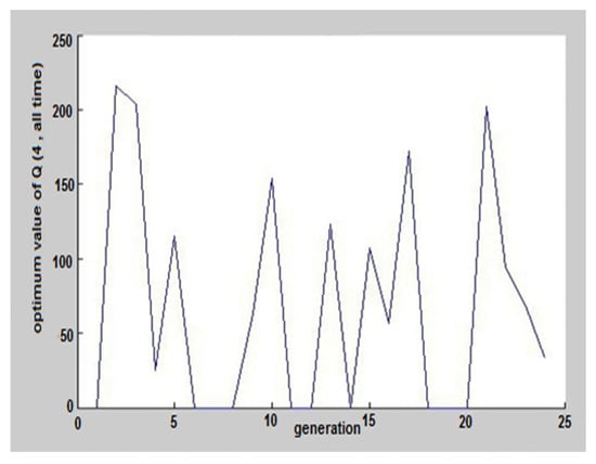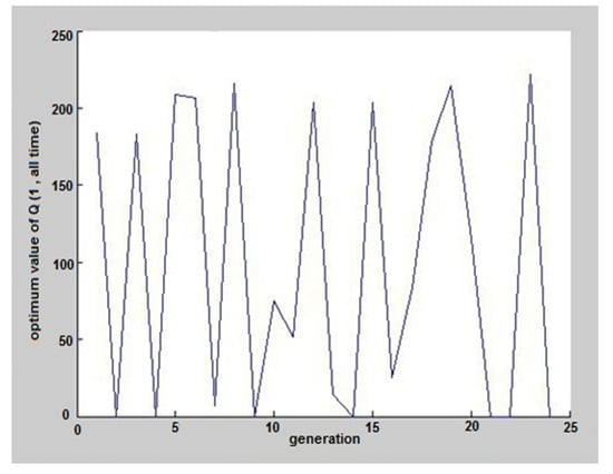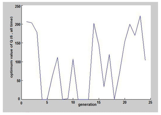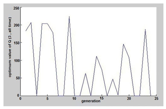 The results of coding in MATLAB software and running of genetic algorithm for an ordinary day, 29 May 2017, can be seen in Figure 5, Figure 6, Figure 7, Figure 8, Figure 9, Figure 10, Figure 11 and Figure 12. Again, according to the MATLAB selector program, this day was selected among these three days. These figures show the hours and the amount of pumped discharge by each pump. When the pumped discharge by the pump was zero, it indicated that the pump was off at that time. The estimated cost by the software is shown in Figure 5, which was equivalent to 1,899,000 Riyals (38.02€), that given its value before applying the algorithm (2,280,000 Riyals), about 15% savings have occurred. Also, on 29 October and 27 January, the costs before applying the scenario were 1,715,000 Riyals (34.34€) and 1,600,000 Riyals (32.04€), respectively, which reached 1,423,450 Riyals (28.50€) and 1,353,600 Riyals (27.11€) with the help of GAO. These results were equal to 17% and 15.4% savings.