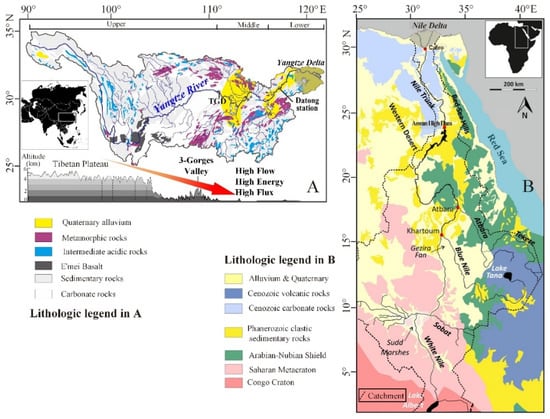 (A) The Yangtze River basin, showing the location of the Three Gorges Dam (TGD) and Datong hydro-gauging station. (B) The Nile River basin, showing the location of the Aswan High Dam (AHD). The lithology of both river basins is modified from [,].