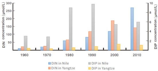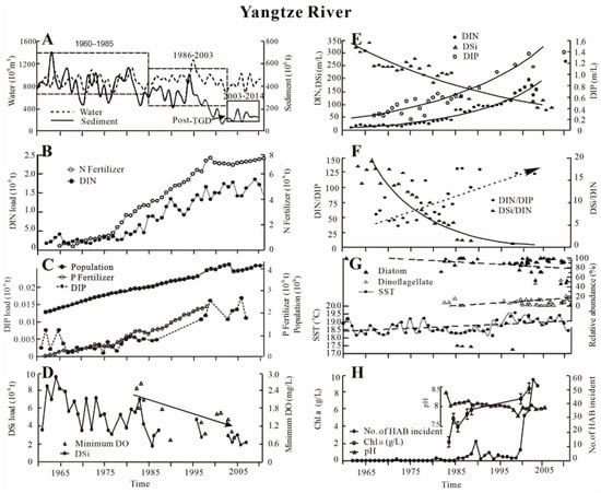 The overuse of fertilizers is directly related to dissolved inorganic nitrogen (DIN) and dissolved inorganic phosphorus (DIP) transport in the Yangtze River (Figure 2B,C). Recently, DIN and NIP are increasing from the urbanization of the river basin [].