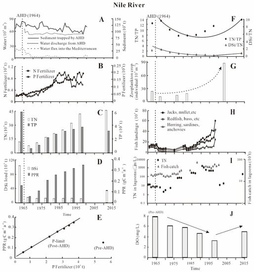 Long–term variations of both Nile River riverine materials transport to the delta-estuary and estuarine ecological components. (A) Sediment and freshwater []; (B) Fertilizer []; (C) TN and TP loads [,]; (D) DSi load and PPR [,]; (E) PPR and P-fertilizer [,]; (F) N/P and DSi/TN [,]; (G) Zooplankton crop in Abu-Qir Bay []; (H) Fish landing []; (I) Inorganic nitrogen concentrations and the fish catch of the 4 Nile lagoons [,]; (J) Dissolved oxygen (DO) concentrations in the Maryut Lagoon [,];. TN: total nitrogen; TP: total phosphorus; PPR: primary production rate.