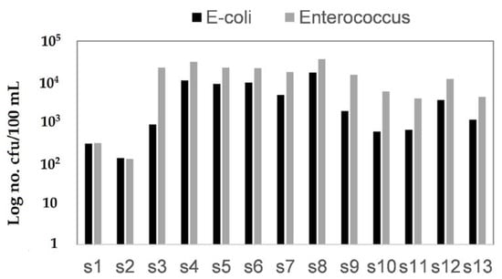 E. coli and Enterococcus spp. numbers in stormwater samples. S1 is dry weather sample and S2–S13 are wet weather samples collected between March 2011 to April 2012.