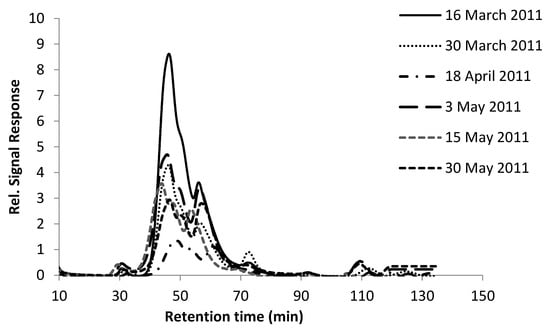 Figure 3 reveals the size distribution of DOM determined by liquid chromatography with organic carbon detection for six events to illustrate the variability of DOM composition (only six out of 13 events are shown to minimise congestion in the figure). The graph indicates that there was a significant variation in the DOM constituents in events. The DOM ranged between 2.19 and 7.8 mg/L with an average of 4.4 mg/L in wet weather events and 7.73 mg/L during dry weather conditions. The first dry weather sample taken on 7 March 2011 (grab sample) had the highest DOC concentration. It was assumed that stagnation in the flow caused high DOC in the drain. During the dry weather period, the humic fraction level was almost two times higher compared to the wet weather period. In wet weather events, the humic fractions were in the range of 643 to 6243 mg/L with an average of 2639 mg/L. From a contribution ratio perspective, the humic fraction was 54% in the dry weather period, whereas it ranged between 29 and 45% in wet weather events.