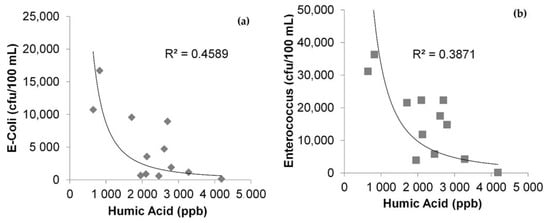 The correlation coefficients calculated from non-linear regression (power curve) between E. coli and DOC, hydrophobic organic carbon (HOC, calculated as DOC minus CDOC)), chromatographic dissolved organic carbon (CDOC) and humic fractions are shown below in Table 1. This analysis shows that the hydrophobic fraction may have less influence on the mobility of E. coli and Enterococcus spp. compared to the hydrophilic fraction. As the hydrophobic fraction is less polar, it mainly interacts with microbes via adsorption [,,]. Among the hydrophilic fractions, humic substances showed a negative correlation, indicating that their presence may disfavour FIB transport. The relationship between E. coli and Enterococcus spp. and DOC is plotted below.