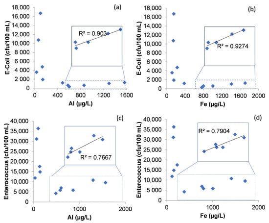 Relationship between metal ions and E. coli (a,b) and Enterococci spp. (c,d).