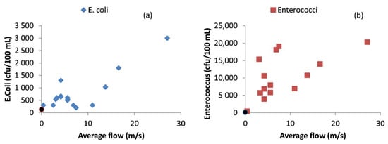 Relationship between flow rate and E. coli (a) and Enterococcos (b) (the black dots represent dry weather flow data).