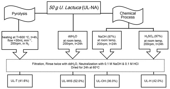 The novelty of this study was the activation of dried U. lactuca collected from Red Sea by different chemical and pyrolysis treatments. Most of previous studies utilized U. lactuca without activation [26,27,28,29]. The obtained results will be significant in addressing the growing demand for adsorbents used in environmental protection processes and the resultant increase in their price.