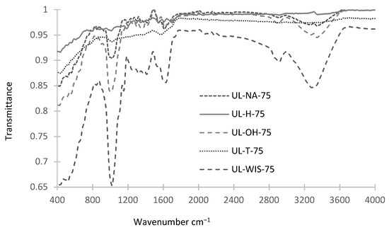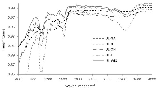 IR Spectra of the untreated (UL-NA), UL-WIS, and treated (UL-H, UL-OH, UL-T) dry U. lactuca before biosorption.