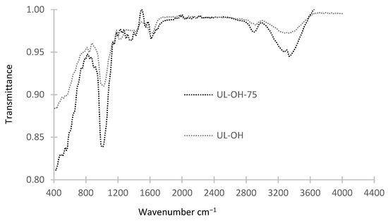 The MB spectrum shows several intense peaks at 3410 cm−1 (attributed to ‒NH/‒OH) that correspond to the absorbance of stretch vibration, while the peak at 2928 cm−1 corresponds to the symmetrical stretch CH of the peak ‒CH2. The bands at 1572 cm−1 and 1442 cm−1 belong to the stretch bands of CO and CN of amide II and to the symmetrical stretching peak of carboxyl (‒COOH), respectively. The intense peaks at 1140 cm−1 and 854 cm−1 correspond to the flexion band of NH and CN of amide III [52]. Figure 3, Figure 4 and Figure 5 show the spectra of (UL-NA-75, UL-WIS-75, UL-H-75, UL-OH-75, and UL-T-75) after biosorption. The peaks around 3307–3399 cm−1 (Table 2) with respect to NH/OH absorbance decreased, and a new peak appeared at 3317–3360 cm−1 as a reinforcement of the CH asymmetric vibration peaks of CH3. This change most likely corresponds to the adsorption of methylene blue on the adsorbent. This means that these two functional groups participate in the MB adsorption process. In addition, the IR spectrum shows the disappearance of absorbance at 1151–1161 cm−1, corresponding to v(C–O–C) of carbohydrates.
