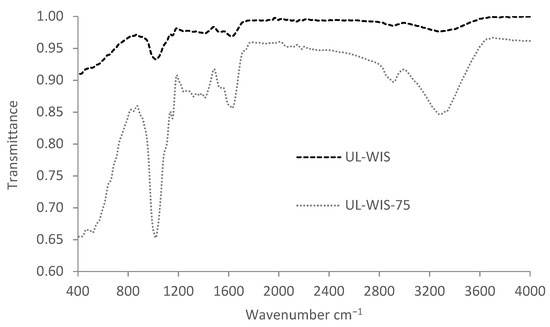 IR spectra of the water insoluble substance (UL-WIS) dry U. lactuca before and after 75 min of contact with MB.