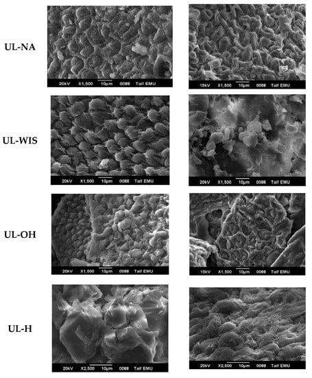 However, this surface modification was irregular in structure and more porous in UL-OH and UL-WIS than UL-H and UL-T. However, the acid treatment (UL-H) and that using carbonization (UL-T) were moderately smooth, with fewer cracks and voids than all other carbon compounds activated by alkaline treatment (UL-OH) and the water insoluble substance (UL-WIS). Therefore, the large surface area explains the better adsorption capacity.