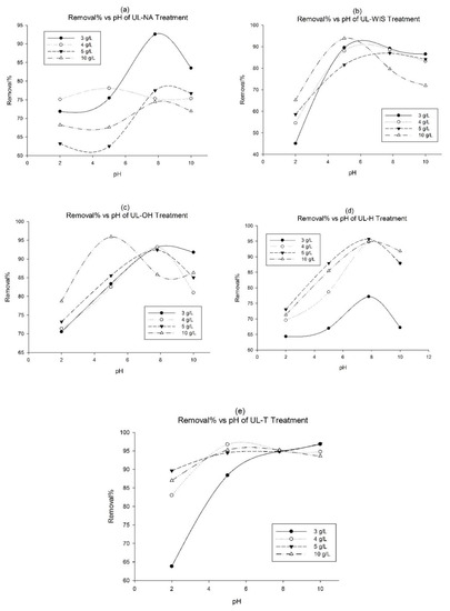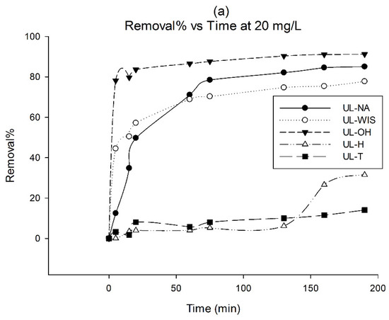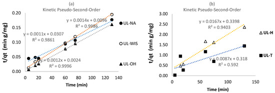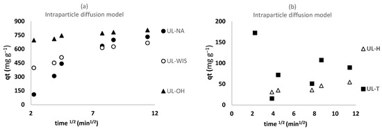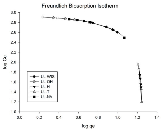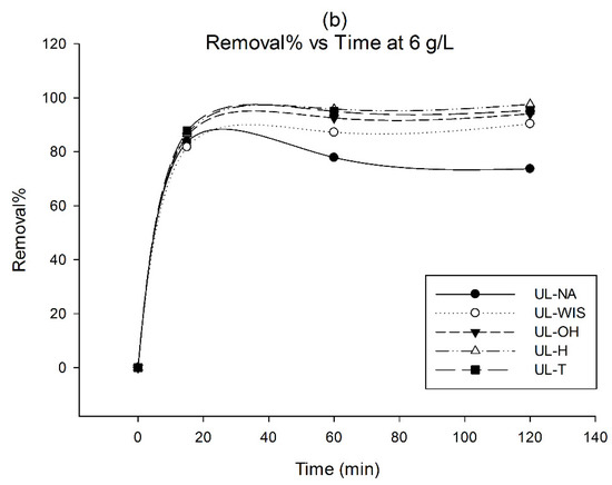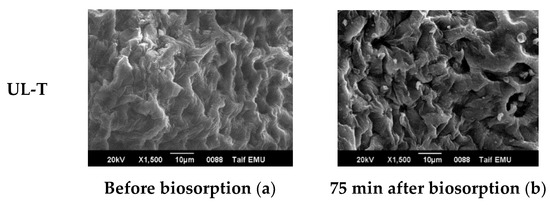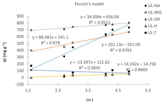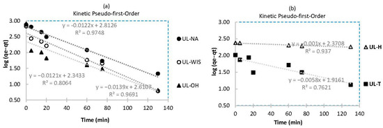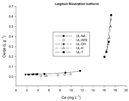 The results suggest that the most suitable mechanism in the biosorption process of the adsorbents UL-NA and UL-OH on MB is by chemical bonds rather than by ion exchange [53,59]; thus, in UL-WIS, UL-H, and UL-T, the mechanism in the biosorption process was probably the ion exchange type.