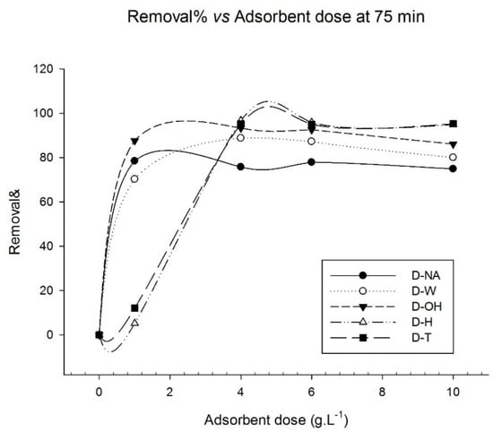 To examine the effect of the adsorbent of U. lactuca in removing the adsorbate (the MB dye), we varied the doses of adsorbent while keeping the MB solution constant (16 mg·L−1). The results obtained have been grouped in the curve in Figure 8. It can clearly be seen that, from 1 g biomass, the adsorbed quantities of MB no longer evolve for all treatments, except for UL-H and UL-T. This behavior can be illustrated with regard to the increase in the quantity of specific sites for the biosorption of MB by the variation of the dose of the adsorbents used, and this occurs up to a dose of 5 g/L. From here the number of sites becomes stable [65,66]. In contrast, Karimel at [67]. have shown that the cationic dye can easily access the biosorption sites as long as the dose of adsorbent used in the dye solution is low. However, the integration of adsorbents makes it possible to increase the number of biosorption sites to form electrostatic bonds, so at a high dose of adsorbent, the solution becomes congested, which makes it difficult for the cationic dye to approach the biosorption sites. Thus, a large dose of adsorbent causes agglomerations of particles in solution and consequently a reduction in the total biosorption surface and a reduction in the amount of adsorbate per unit of mass of adsorbent. The results obtained by Karim et al. [67] and El Sikaily et al. [27] are in agreement with our results for UL-NA, UL-WIS, and UL-OH but are contrary to the results obtained for both UL-H and UL-T [68].