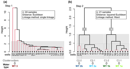 Subsequently, the water types were classified based on the results of HCA and the interpretation of the hydrochemical composition. Cluster C1 was defined as water type 1 with the subdivision of subtypes 1a (C1-1) and 1b (C1-2) and cluster C2 as water type 2 with the subdivision of subtypes 2a (C2-1) and 2b (C2-2). The outliers were summarised as water type 3 (Figure 2).