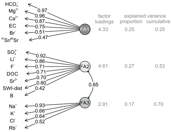 EFA using multi-likelihood method and oblique (oblimin) rotation indicates that the system is driven by three statistical significant factors, which explain a variance of 70% in the data set (Figure 3, Appendix A.4). The factor loadings were 4.33 for FA1, 4.61 for FA2 and 2.91 for FA3 (Table A5). With the data set parameters used, the three factors are not capable of explaining the total variance of the entire data set and, therefore, may not cover all hydrogeological processes that influence the hydrochemical composition of thermal groundwater.