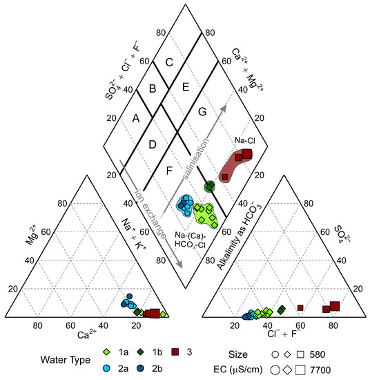 Table 1 summarises the hydrochemical parameters for the complete data set and each clustered water type with minimum, maximum and mean values. The hydrochemical facies after [54] of the water samples is displayed in the Piper plot with the EC as scale for the symbol size (Figure 4).