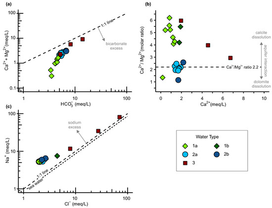 It can be concluded that the water chemical composition of water type 1b is comparable to water type 1a, but shows considerably higher levels of mineralisation, alkalinity and salinity, which may indicate hydrogeological processes influencing the hydrochemical evolution of these waters.
