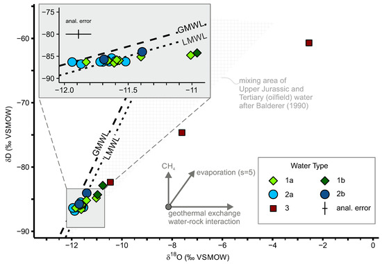 The global meteoric water line GMWL (δD = 8 × δO + 10 ‰) [60] represent the stable water isotope signatures of global precipitation and can be used to determine a meteoric origin of groundwater and temperature dependent effects during recharge or water-rock interaction [61]. The local meteoric water line LMWL (δD = 8 × δO + 8 ‰) of Garmisch-Partenkirchen [62] is representative for the precipitation in the study area at the foot of the Alps.