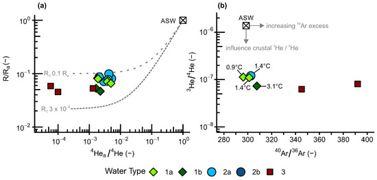 The Ar/Ar ratios can be used to evaluate terrigenous Ar component, which is composed of the radiogenic and in situ produced contribution from K decay, Ar, and the crustal fluxes (Ar) [82]. The atmospheric Ar/Ar ratio R ranges between 295.5 [83] and 298.5 [84]. Higher ratios point to a radiogenic Ar input and accordingly long residence times [76].